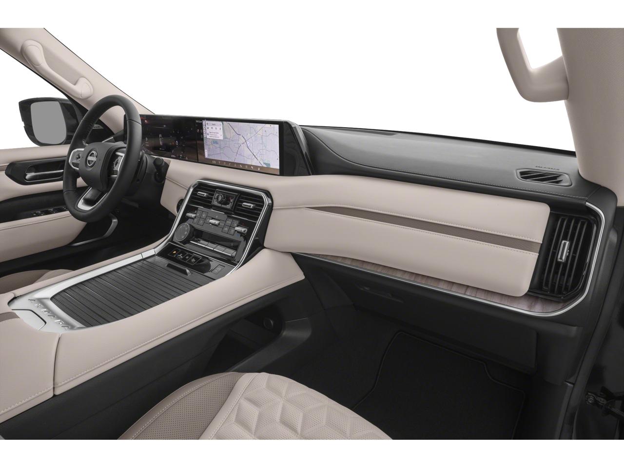 ProPILOT Assist 2.1 (Heads-Up Display), 12 Speakers, 3rd row seats: split-bench, 4-Wheel Disc Brakes, ABS brakes, Air Conditioning, Alloy wheels, AM/FM radio: SiriusXM w/360L, Anti-whiplash front head restraints, Apple CarPlay/Android Auto, Auto High-beam Headlights, Auto tilt-away steering wheel, Auto-dimming door mirrors, Auto-dimming Rear-View mirror, Auto-leveling suspension, Automatic temperature control, Brake assist, Bumpers: body-color, Carpeted Floor Mats with Captain Chairs, Center Front Spoiler, Climate Controlled Heated and Ventilated Front Seats, Compass, Cross Bars, Delay-off headlights, Driver door bin, Driver vanity mirror, Dual front impact airbags, Dual front side impact airbags, Electronic Stability Control, Emergency communication system: NissanConnect Services, External Ground Lighting, Four wheel independent suspension, Front anti-roll bar, Front Bucket Seats, Front Center Armrest, Front dual zone A/C, Front fog lights, Front reading lights, Fully automatic headlights, Garage door transmitter: HomeLink, Genuine wood dashboard insert, Heated door mirrors, Heated front seats, Heated rear seats, Heated steering wheel, HVAC memory, Illuminated entry, Illuminated Kick Plates, Knee airbag, Leather steering wheel, Low tire pressure warning, Memory seat, Navigation system: Google Maps, Occupant sensing airbag, Outside temperature display, Overhead airbag, Overhead console, Panic alarm, Passenger door bin, Passenger vanity mirror, Power door mirrors, Power driver seat, Power Liftgate, Power moonroof, Power passenger seat, Power steering, Power windows, Premium Paint, Quilted Leather Seat Trim, Radio: NissanConnect with SiriusXM 360L, Rain sensing wipers, Rear air conditioning, Rear anti-roll bar, Rear Bumper Protector, Rear reading lights, Rear window defroster, Rear window wiper, Reclining 3rd row seat, Remote keyless entry, Security system, Speed control, Speed-sensing steering, Speed-Sensitive Wipers, Splash Guards, Split folding rear seat, Spoiler, Steering wheel memory, Steering wheel mounted audio controls, Tachometer, Telescoping steering wheel, Tilt steering wheel, Traction control, Trip computer, Turn signal indicator mirrors, Variably intermittent wipers, Ventilated front seats, Voltmeter, and Wheels: 20 x 8.5J Machined and Painted Alloy.
