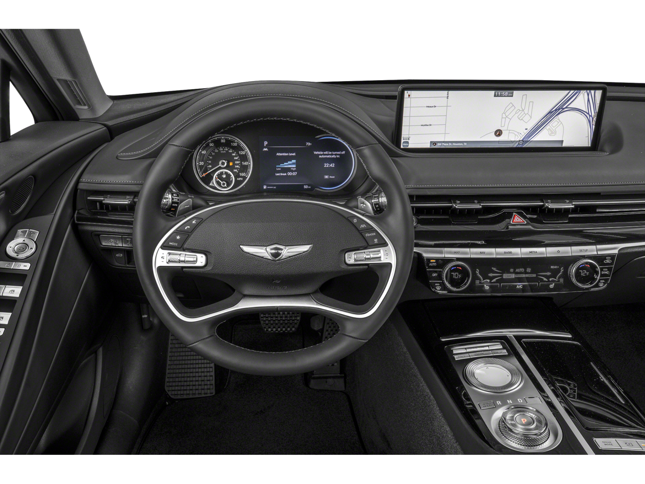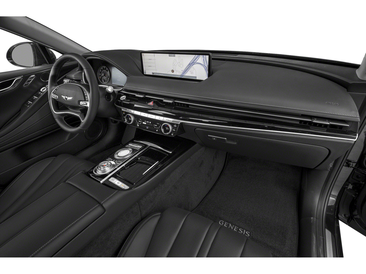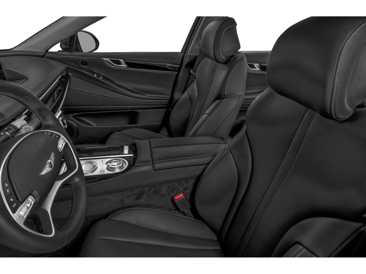 12 Speakers, 4-Wheel Disc Brakes, ABS brakes, Air Conditioning, Alloy wheels, AM/FM radio: SiriusXM, Android Auto & Apple CarPlay, Anti-whiplash front head restraints, Auto High-beam Headlights, Auto tilt-away steering wheel, Auto-dimming door mirrors, Auto-dimming Rear-View mirror, Automatic temperature control, Bumpers: body-color, Compass, Delay-off headlights, Driver door bin, Driver vanity mirror, Dual front impact airbags, Dual front side impact airbags, Electronic Stability Control, Emergency communication system: Genesis Connected Services, Exterior Parking Camera Rear, Four wheel independent suspension, Front anti-roll bar, Front Bucket Seats, Front Center Armrest, Front dual zone A/C, Front reading lights, Fully automatic headlights, Garage door transmitter: HomeLink, Heated door mirrors, Heated Front Bucket Seats, Heated front seats, Illuminated entry, Knee airbag, Leather steering wheel, Leatherette Seating Surfaces, Low tire pressure warning, Memory seat, Navigation System, Occupant sensing airbag, Outside temperature display, Overhead airbag, Overhead console, Panic alarm, Passenger door bin, Passenger vanity mirror, Power door mirrors, Power driver seat, Power passenger seat, Power steering, Power windows, Radio data system, Radio: AM/FM/HD/SiriusXM Audio System, Rain sensing wipers, Rear anti-roll bar, Rear reading lights, Rear seat center armrest, Rear side impact airbag, Rear window defroster, Remote keyless entry, Security system, Speed control, Speed-sensing steering, Speed-Sensitive Wipers, Steering wheel memory, Steering wheel mounted audio controls, Tachometer, Telescoping steering wheel, Tilt steering wheel, Traction control, Trip computer, Turn signal indicator mirrors, Variably intermittent wipers, Wheels: 18x8.0J Alloy.